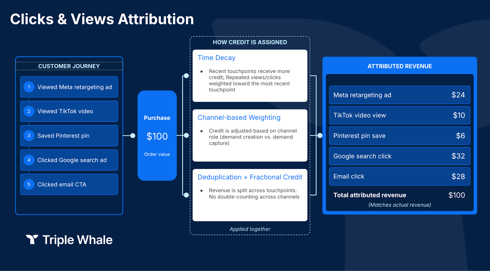 Clicks & Views also includes deduplication logic to prevent inflated reporting. If multiple touchpoints are eligible to receive credit for a conversion, the model distributes credit fractionally across them, ensuring every order is counted exactly once and total cross-channel contribution rolls up cleanly to your actual Shopify-reported revenue.