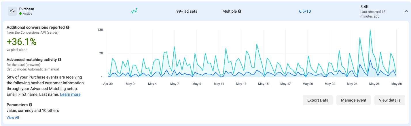 All while relying on first-party data rather than third-party cookies. These events appear in Meta Ads Manager and Events Manager just like Pixel events, supporting the same attribution, reporting, and optimization workflows.