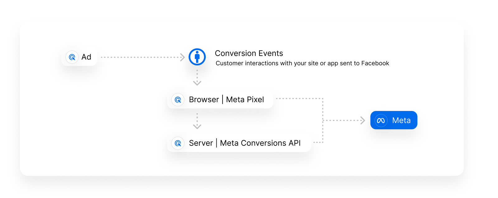 The Meta Pixel sends conversion data from the user’s browser using cookies, while Meta CAPI sends the same types of events server-to-server.