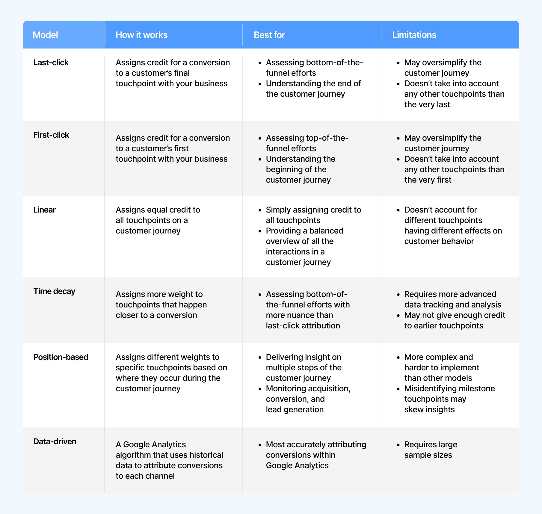 You might be wondering how the last-touch approach measures up against other attribution models, like last-click vs. data-driven attribution or first-click attribution. Here’s a look at some of the most popular models.