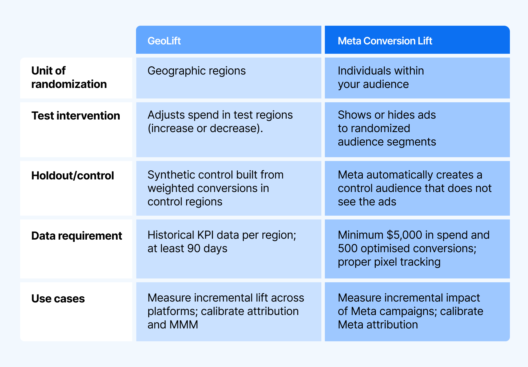 While both are incrementality testing methods, Meta Lift Tests evaluate the causal impact of Meta ads at the user level, whereas GeoLift Tests assess overall business impact by comparing performance across geographic regions.