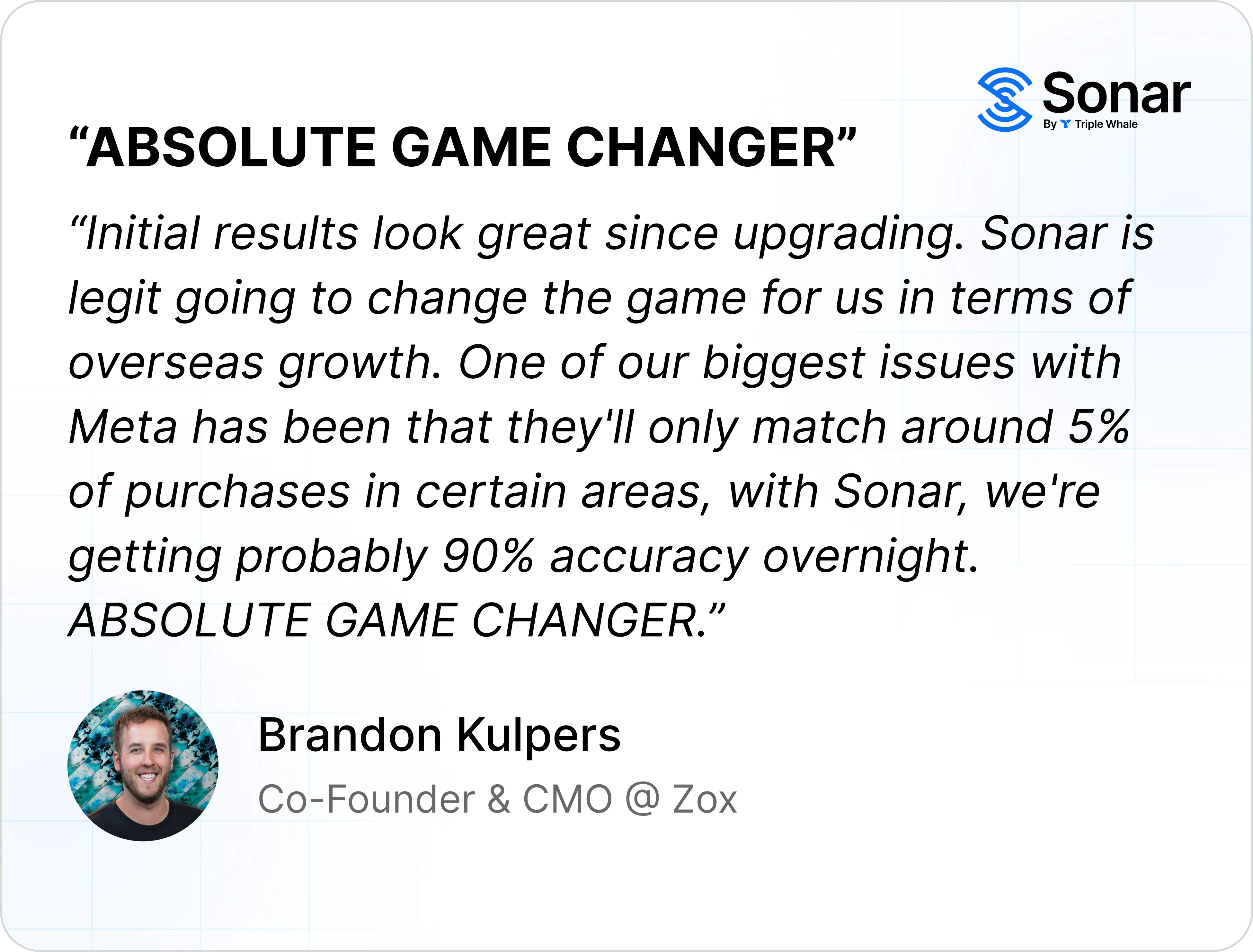 Sonar is Triple Whale’s signal enrichment feature, which enables brands to send enriched data back to marketing platforms, starting with Meta and Klaviyo. Sonar is set to redefine the landscape of digital advertising through enhanced data accuracy and visibility. It provides advertisers with critical conversion insights directly into Meta’s platform, optimizing ad performance with precision never seen before. In this article, we’ll share early results from an ecommerce brand, Zox, whose implementation of Sonar has enhanced data visibility and revitalized their marketing strategy in the EU & UK, achieving a level of profit they hadn’t seen in years.